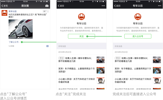 支持“图文”和“视频”的广告形式,点击文案可配置“查看详情”和“了解公众号”,点击后跳转模板化的公众号详情页,可满足提高公众号知名度,培养潜在消费者及忠诚粉丝的推广诉求。